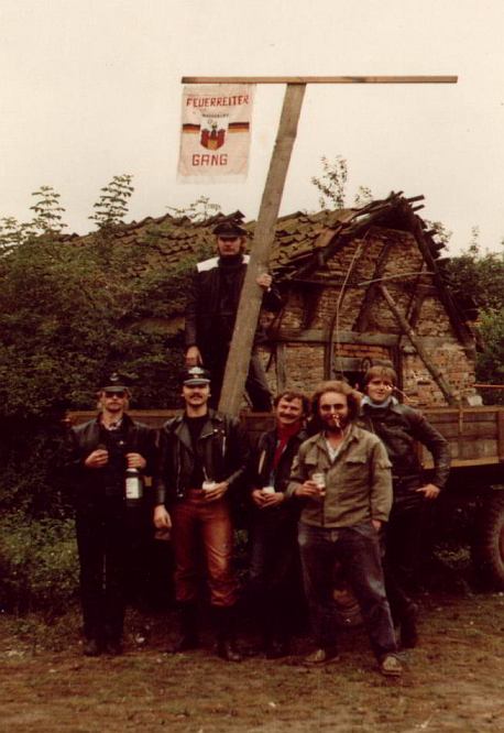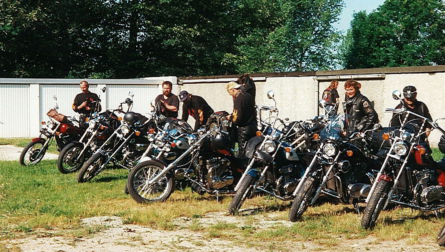 Aufstellung vor der Rosenmühle und unter unserer ersten Fahne, das Bier schmeckte uns am besten zwischen den Bikes.